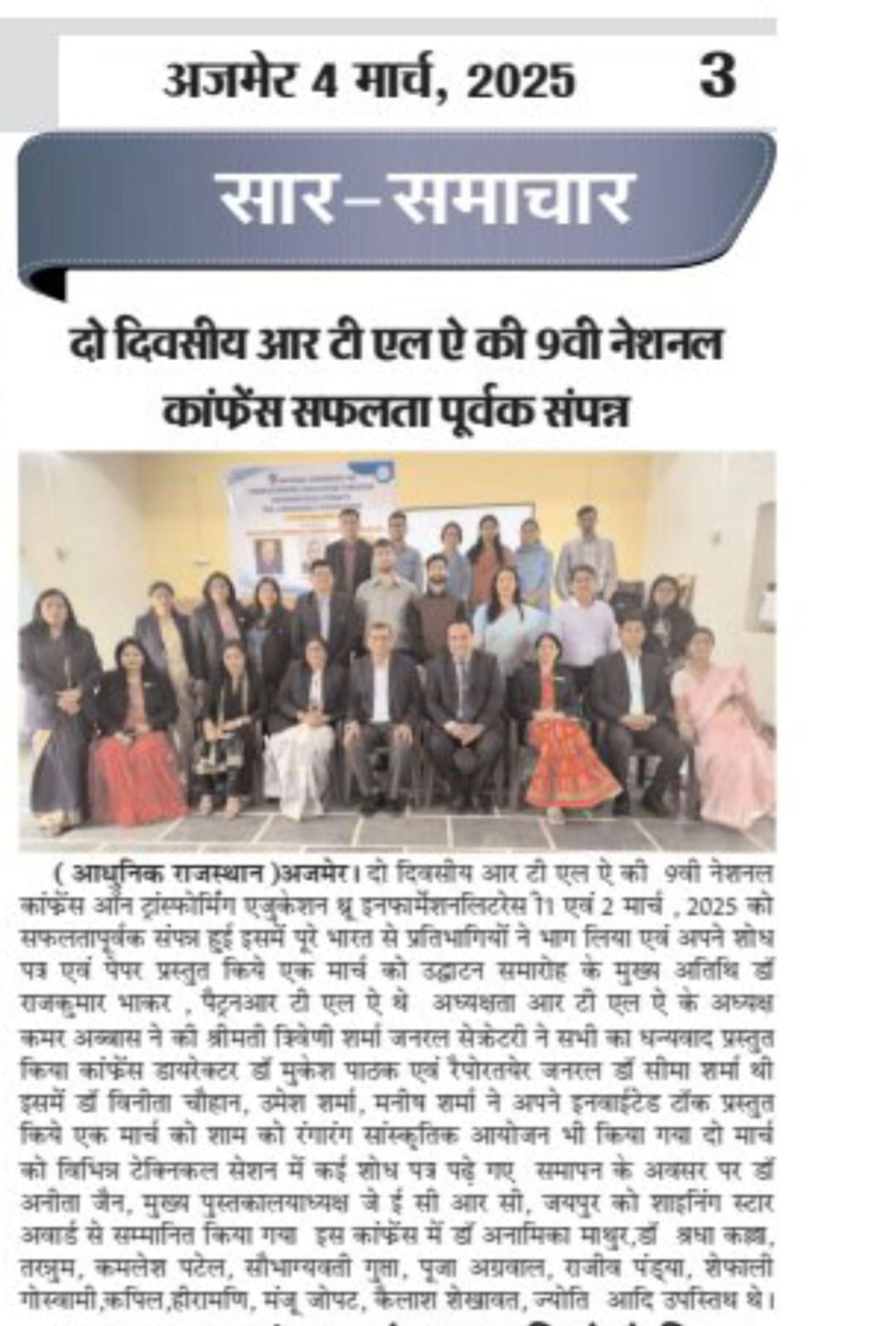 | 19. | March 01-02, 2025 | 9th National Conference on Transforming Education Through Information Literacy: The Librarian's Perspective | Mr. Qumar Abbas (Organizing Secretary) | King Edward Memorial Hotel, Ajmer | ||